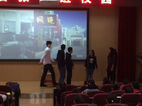 充分考虑到小学的教育模式和小学生的自身特点,活动由三个环节构成。第一环节是以制止校园暴力与网络安全为主题的舞台剧,由邵悦、吴文韬、王一凡、马铭、李琳、戴佳琪、辛瑞明、叶欧仪、潘乐容9名同学出演,2015级邵悦指导,2016级潘乐容编剧。故事讲述了受到蛊惑沉迷网络,受校园恶霸欺凌的小学生小明,在老师同学的帮助下走出阴影,蜕变为一个阳光积极的好少年的故事。同学们前期进行了长时间的准备与磨合,反复修改剧本,琢磨细节。舞台剧以小学生的视角再现了真实生活中存在的事件,将现实生活中可能存在的不良事件以及对其的遏制以轻松的形式展现在同学们面前,主题积极向上引发了同学们对防止校园暴力和网络安全有关法律法规的关注和深入的思考。